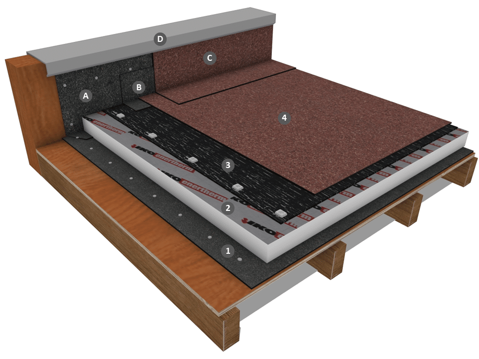 un enduit d’imprégnation à froid, type IKOpro Primaire bitume Adérosol SR + une feuille de bitume modifié SBS d’épaisseur 1,2 mm avec sous-face auto-adhésive et surface aluminium, type IKO VAP STICK ALU, les recouvrements sur 8 cm sont jointoyés en retirant le galon siliconé pelable et en marouflant soigneusement.