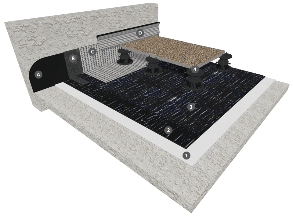 Dans le cas de dalles béton, pierre ou bois la mise en œuvre s’effectue selon les dispositions du NF DTU 43.1 en tenant compte des dispositions particulières de la fiche technique de la dalle.