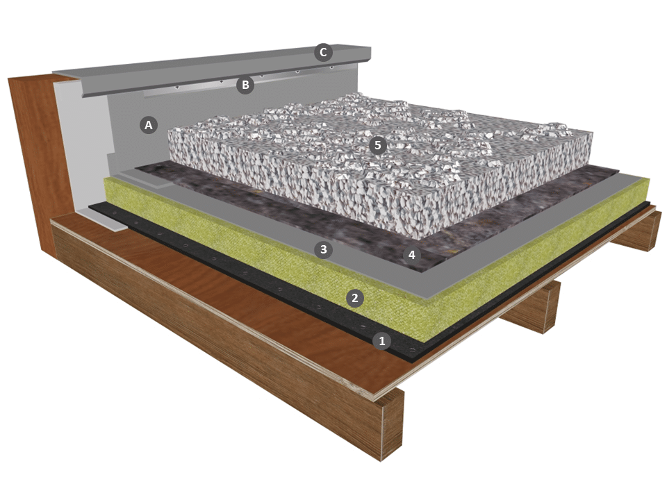 L’ÉCRAN SM 300 n’est pas nécessaire si le gravier est roulé et de granulométrie ≥ 5/25 (le plus gros granulat ne dépassant pas 2/3 de l’épaisseur de la couche de protection). Dans le cas contraire, une couche de séparation chimique ou mécanique, type ECRAN SM 300 est déroulée librement sur la membrane d’étanchéité à recouvrement de 10 cm.