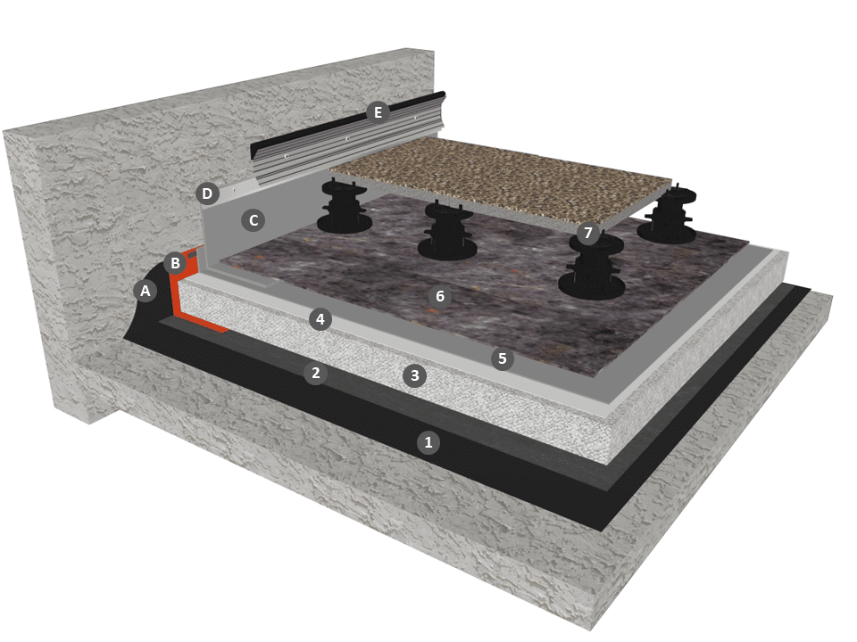 Dans le cas de dalles béton, pierre ou bois la mise en œuvre s’effectue selon les dispositions du NF DTU 43.1 en tenant compte des dispositions particulières de la fiche technique de la dalle.