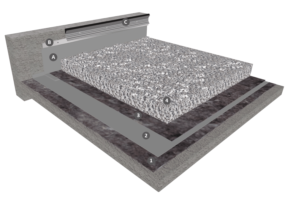 L’ÉCRAN SM 300 n’est pas nécessaire si le gravier est roulé et de granulométrie ≥ 5/25 (le plus gros granulat ne dépassant pas 2/3 de l’épaisseur de la couche de protection). Dans le cas contraire, une couche de séparation chimique ou mécanique, type ECRAN SM 300 est déroulée librement sur la membrane d’étanchéité à recouvrement de 10 cm.