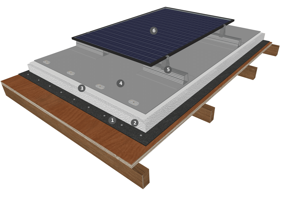 Procédé photovoltaïque à plat sur étanchéité monocouche pvc-p fixé mécaniquement avec isolation