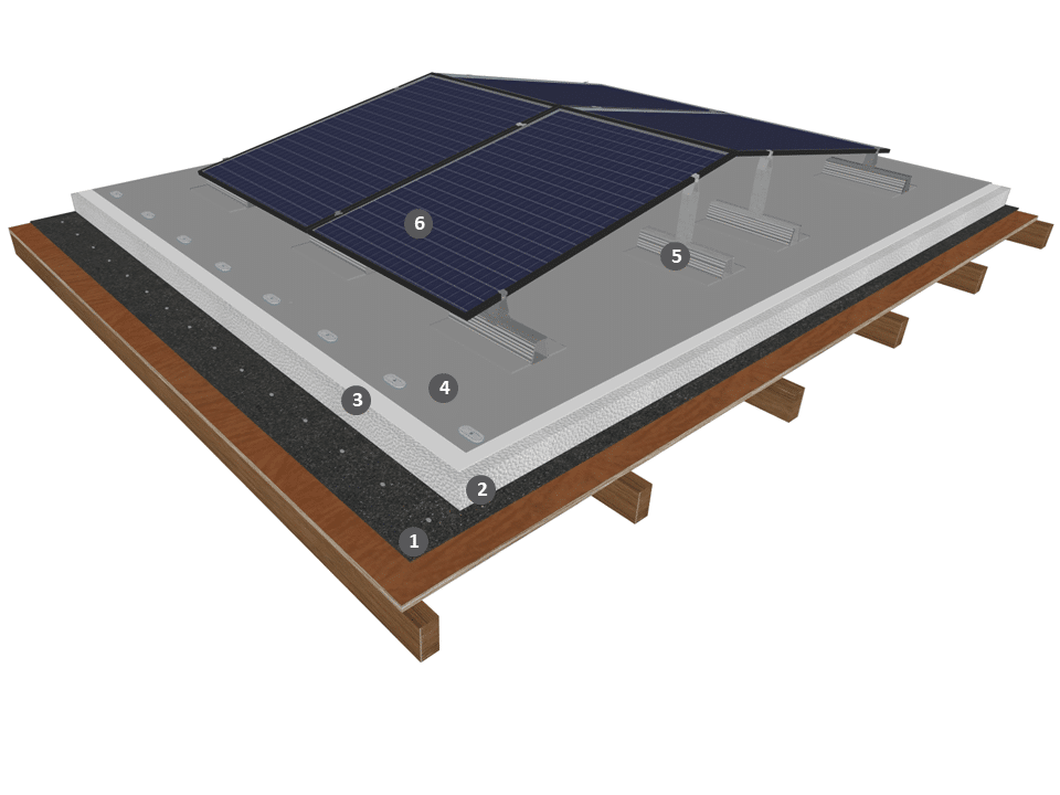 Procédé photovoltaïque double shed sur étanchéité monocouche pvc-p fixé mécaniquement avec isolation