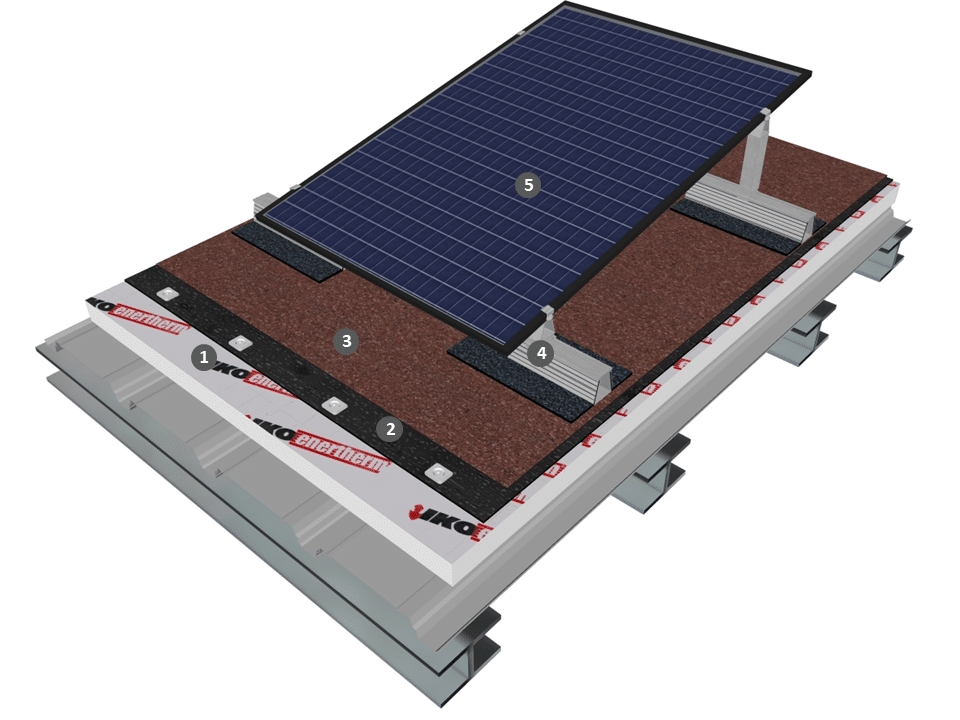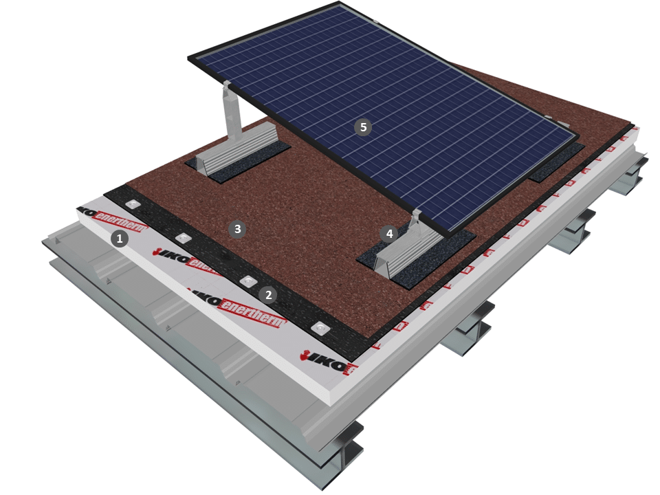 Procédé photovoltaïque simple shed sur étanchéité bicouche fixée mécaniquement avec isolation