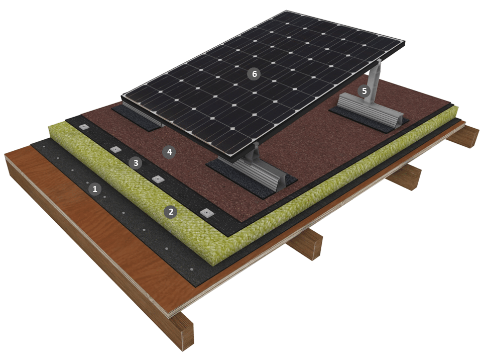 Procédé photovoltaïque simple shed sur étanchéité bicouche fixée mécaniquement avec isolation