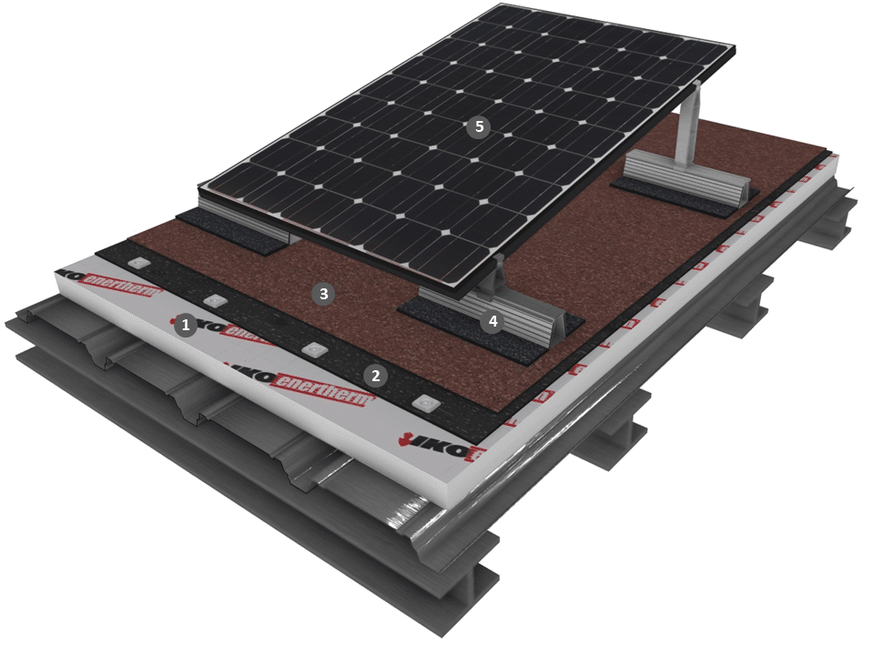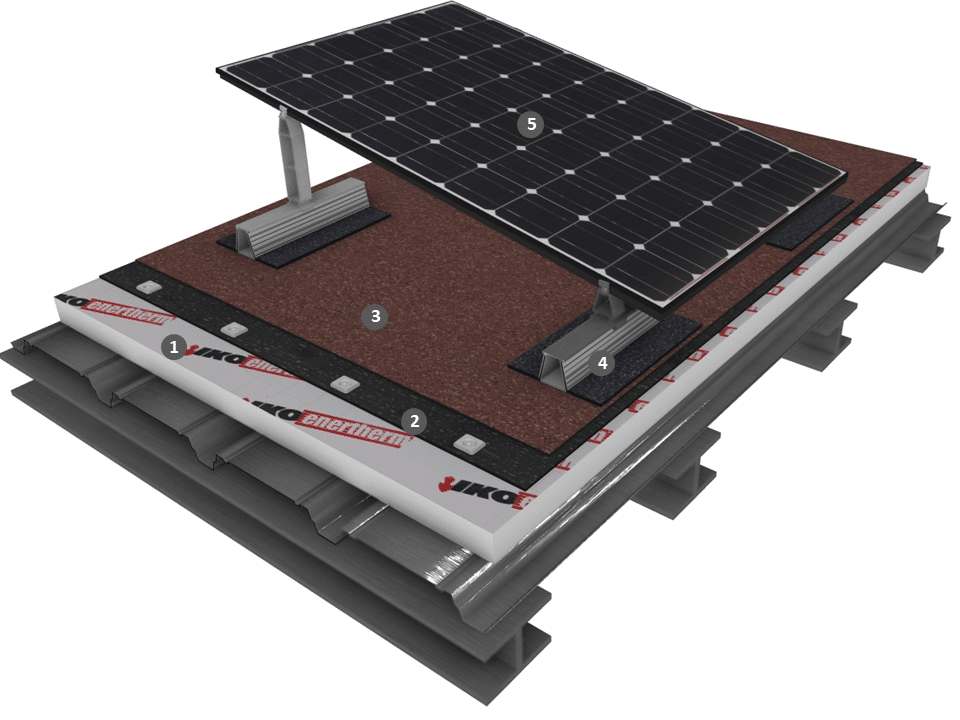 Procédé photovoltaïque simple shed sur étanchéité bicouche fixée mécaniquement avec isolation