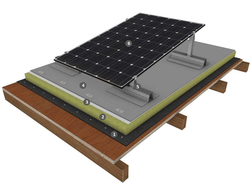 Procédé photovoltaïque simple shed sur étanchéité monocouche pvc-p fixé mécaniquement avec isolation